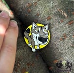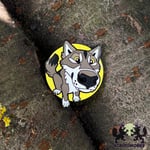 This happy wolfie says HELLO! These pins are 40 mm/1.57 inches wide, made from black dyed metal and soft enamel with a metal butterfly clasp back. Unlimited run.